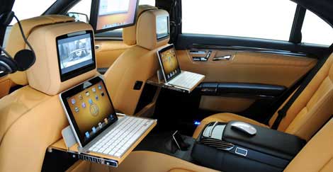 Pour cette nouvelle offre, Brabus a donc choisi d’intégrer dans une Classe S les derniers produits en provenance de chez Apple. La vedette est ici l’iPad, confortablement installé sur les tablettes dotées d’un support prévu à cet effet, et complété par un clavier sans fil. Pour garder tout cela hors de vue à l’arrêt, un rangement est prévu dans l’accoudoir central, pour deux iPad et deux claviers…